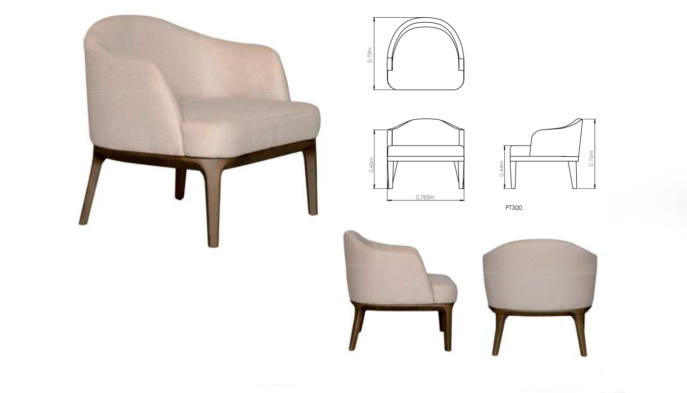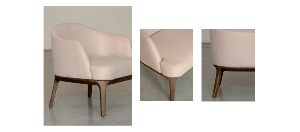 Estrutura toda em metal na cor preto MTX. Estrutura interna em madeira eucalyptus. Assento fixo em espuma D28 pure. Encosto em espuma D23 soft. Base em madeira maciça na cor palha fosco. REF Tecido: A004