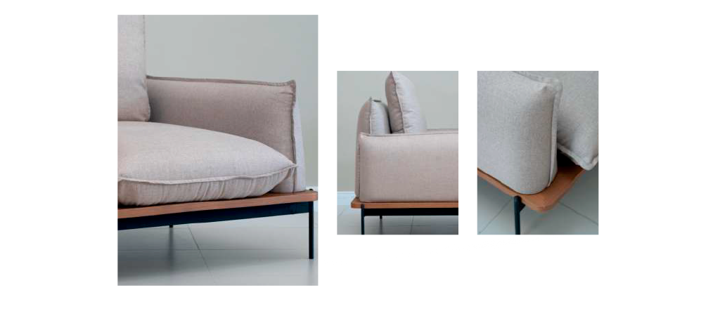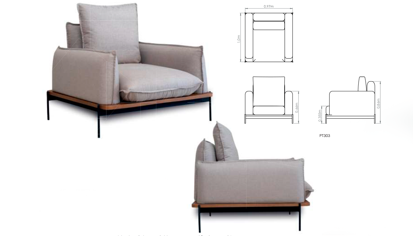 Estrutura interna em madeira eucalyptus. Assento fixo em espuma D28 pure. Encosto e braços em espuma D23 soft. Almofadas em fibra siliconada. Base em mdf laminado (tauari). Pé em metal na cor preto fosco micro textura. REF Tecido: A003