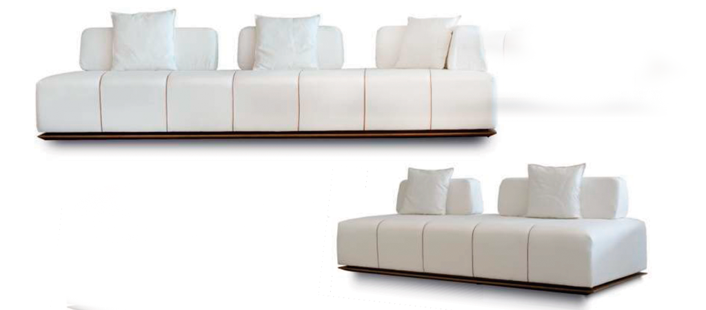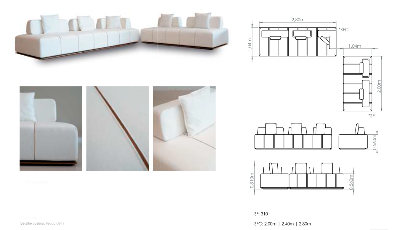 Estrutura interna em madeira eucalyptus. Assento em espuma D28 pure. Encosto em espuma D28 soft. Almofadas em fibra siliconada. Pé em madeira maciça na cor amêndoa fosco. REF Tecido: A001 Detalhe costura: Tecido G017