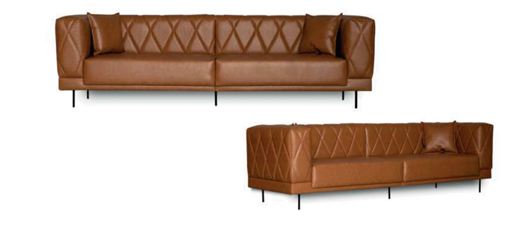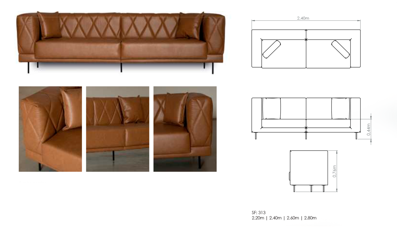 Estrutura interna em madeira eucalyptus. Assento fixo em espuma D28 pure. Encosto e braços em espuma D23 soft. Almofadas em fibra siliconada. Pé metal na cor preto MTX. REF Tecido: G017